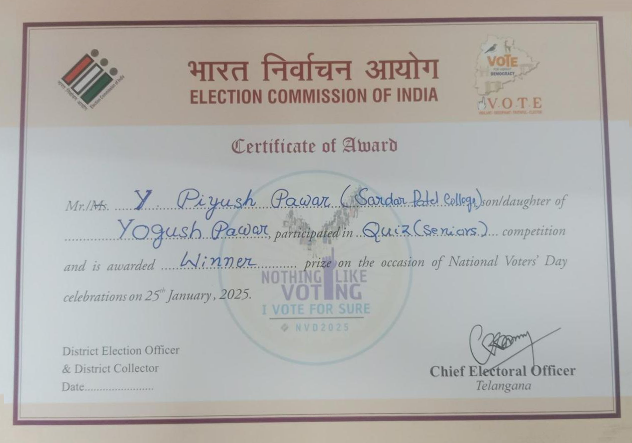On the 15th National Voters' Day, celebrated on 25th January 2025, Abhiram, a student of MBA 1st Year, and Y. Piyush Pawar, a student of BBA 4th Semester from Sardar Patel College, participated in a college-level Essay Writing Competition and a district-level Quiz Competition conducted by the Greater Hyderabad Municipal Corporation (GHMC).