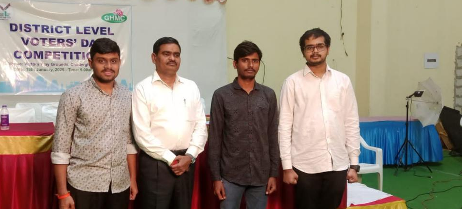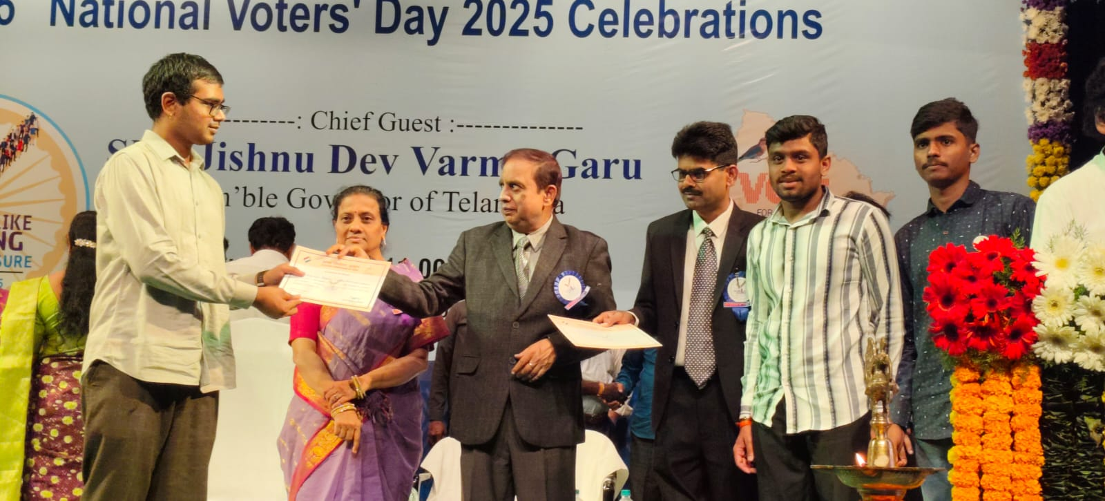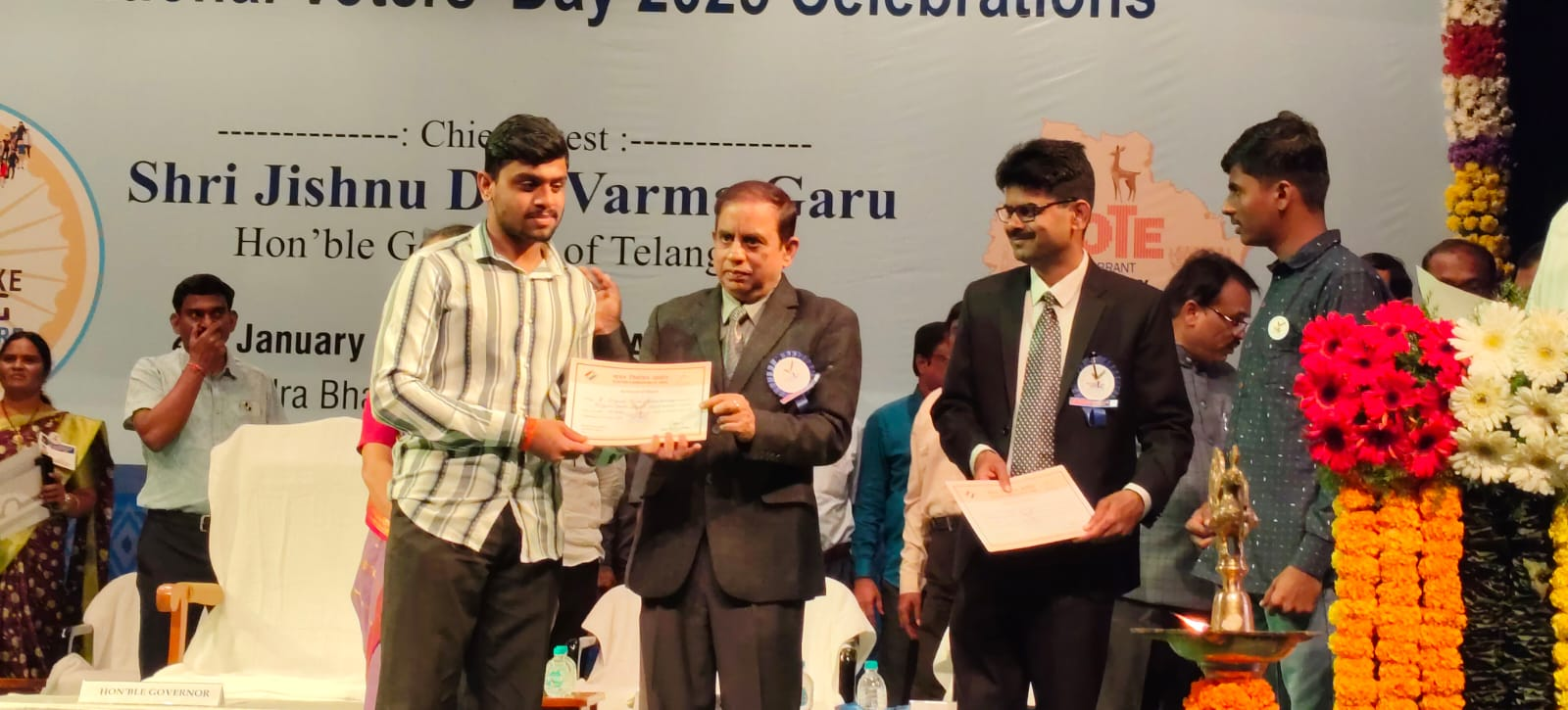 To celebrate National Voters' Day, they were awarded the Winner’s Prize at Ravindra Bharathi by Dr. C. Sudharshan Reddy Garu, Telangana State Chief Election Officer.